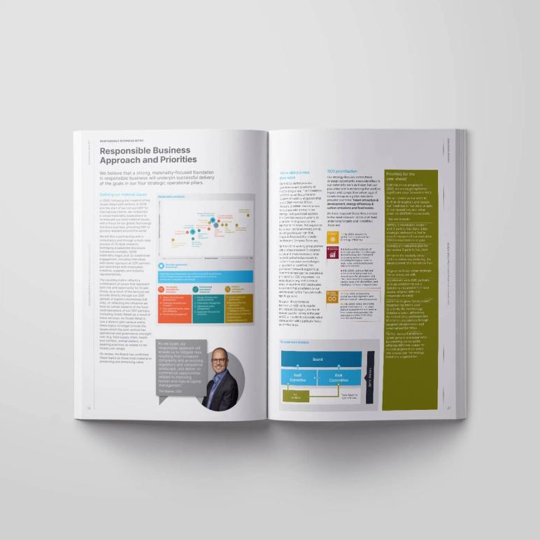 Throughout the report, we leveraged infographics to elevate Ocado’s corporate brand and effectively illustrate their narrative. Key graphics were designed to communicate the interplay between their strategy and responsible business practices. By streamlining the report, we achieved a 10% reduction in overall size.