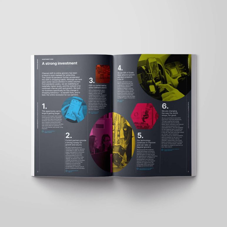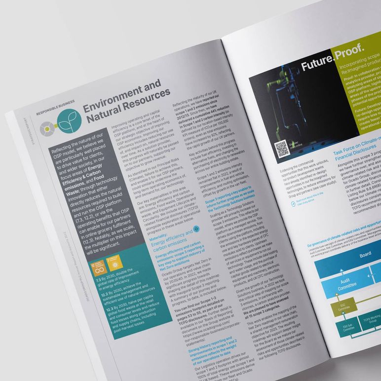 Additionally, we focused on presenting Ocado’s strong investment case through an engaging spread at the beginning of the report. This section covered six areas of opportunity and future growth. Integrating environmental, social, and governance (ESG) considerations throughout the report was a key priority, demonstrating Ocado’s commitment to sustainability and their adaptation to a greener economy. We also outlined their goals and objectives as they progress towards Net Zero.