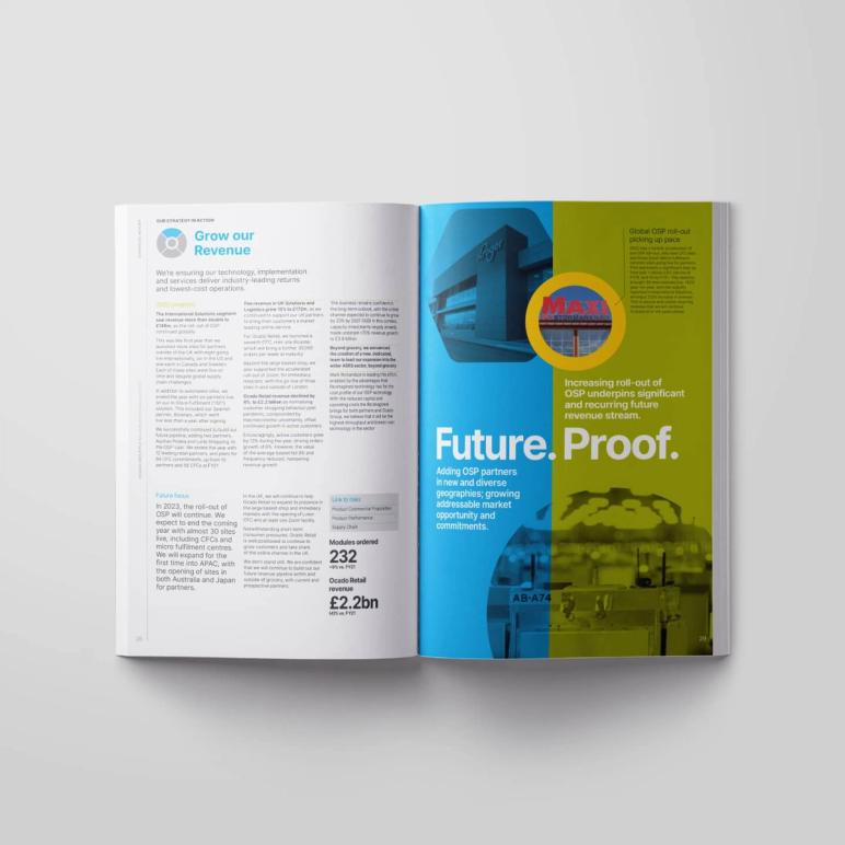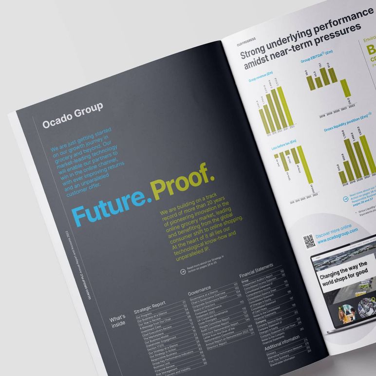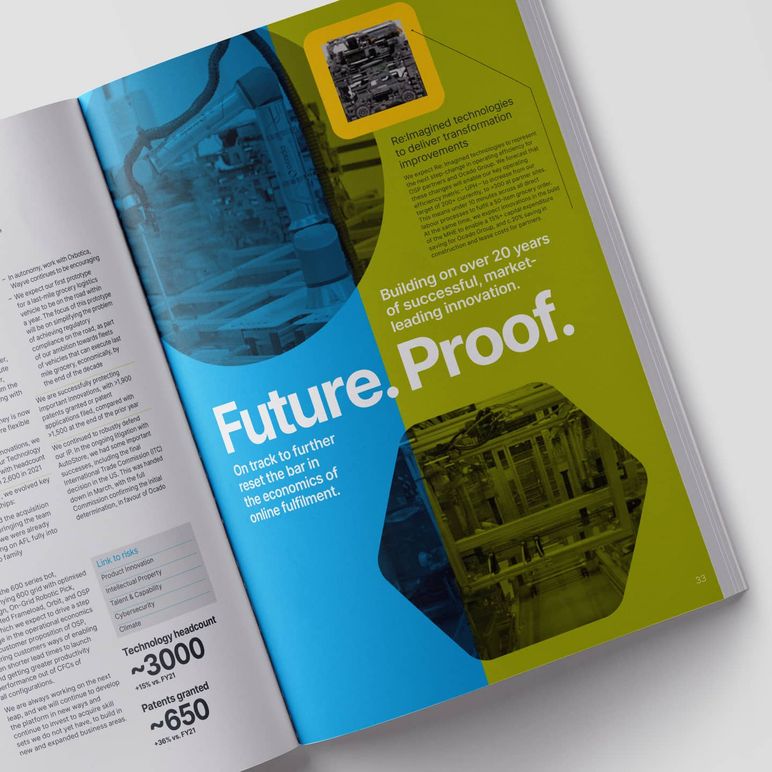 With ambitions beyond grocery, Ocado aims to become a leader in technology. Central to their success is their technological expertise and unrivalled IP. Our objective was to advance Ocado’s reporting and establish a strong sense of purpose through this year’s theme, ‘Future. Proof.’