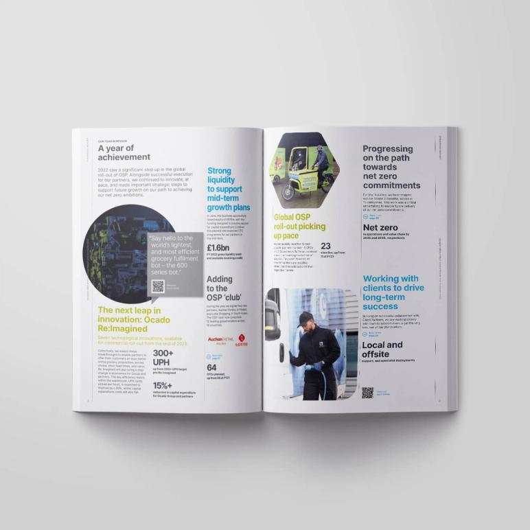 The report tells a compelling story of purpose-driven value creation. To emphasise this, we introduced a ‘Year in review’ section that showcased Ocado‘s accomplishments and the global expansion of their Online Solutions Provider (OSP) platform. We also highlighted their successful collaborations with client partners and outlined their path to achieving net-zero emissions.