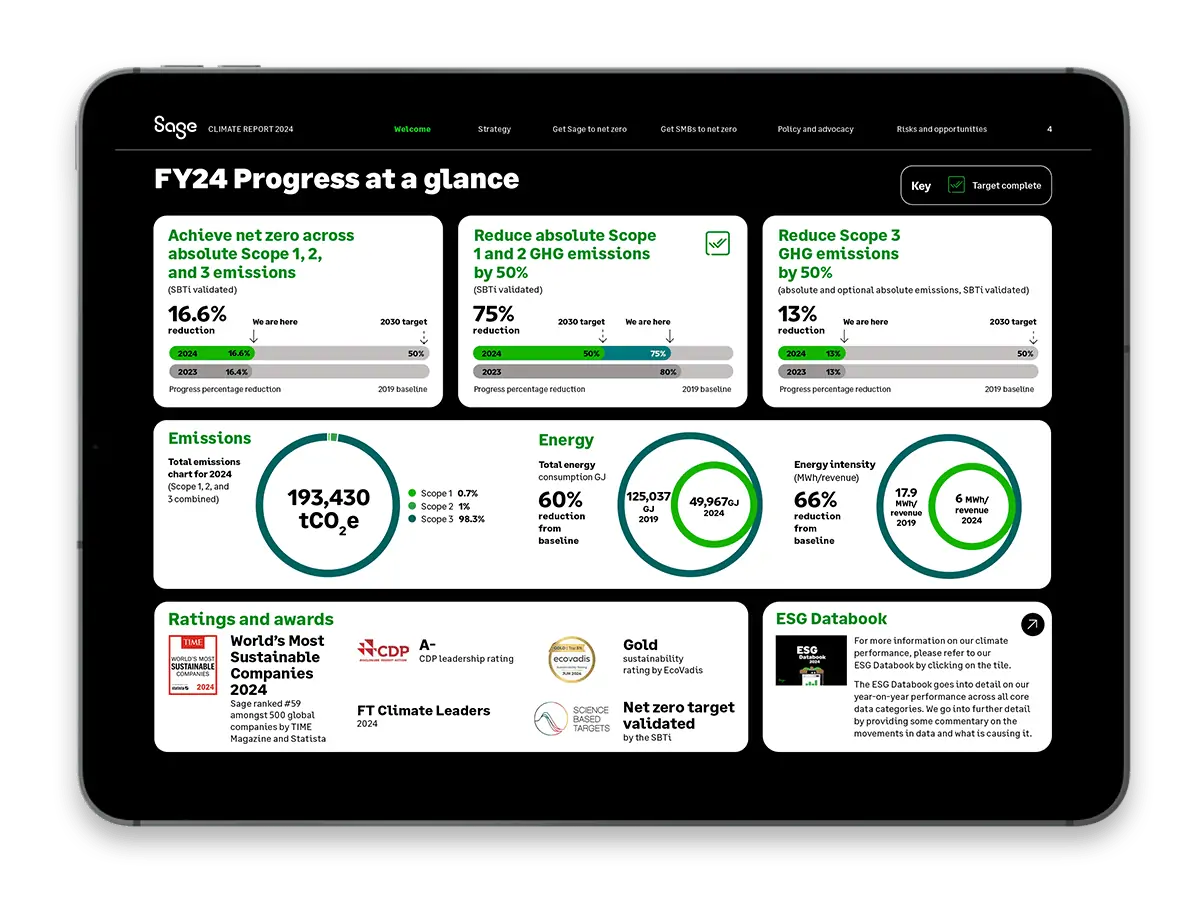We structured the reporting around Sage’s Sustainability and Society Strategy and a refreshed double materiality assessment. Each of three pillars – Protect the Planet, Tech for Good and Human by Design - is presented with clear KPIs, and aligned to GRI, SASB, TCFD and TPT frameworks.