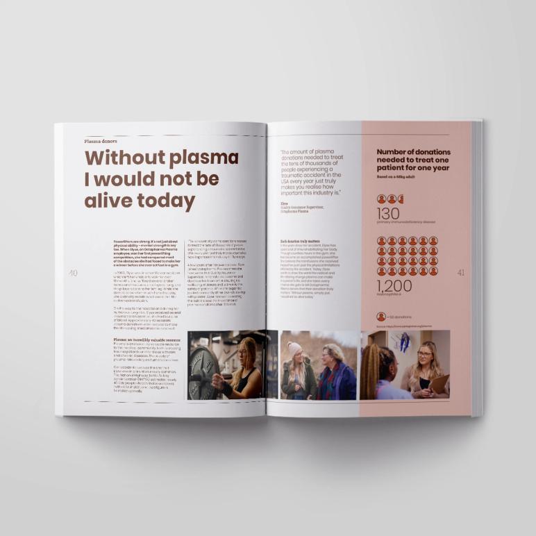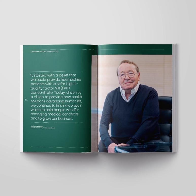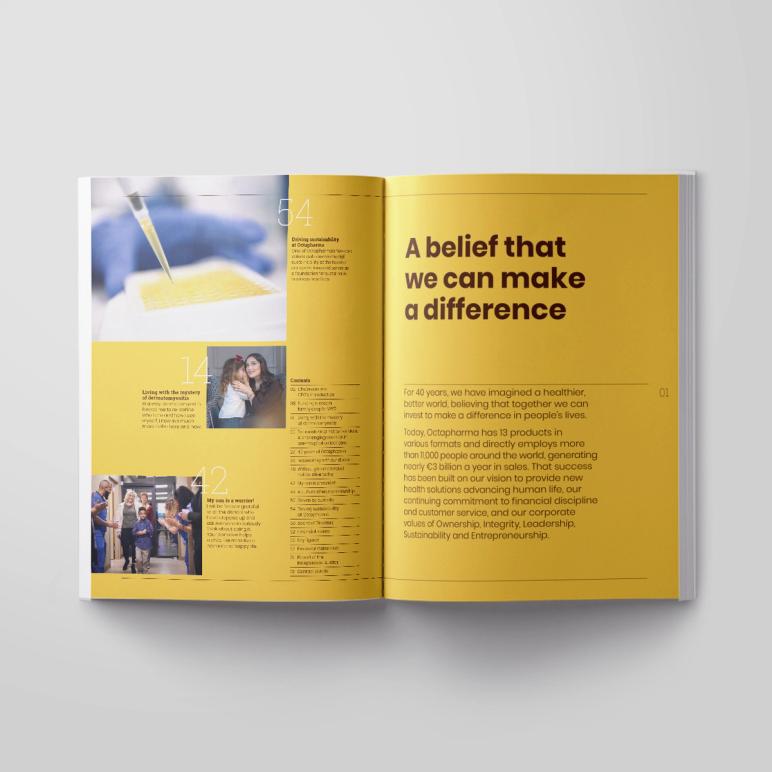 To bring the theme to life from a narrative perspective, we hosted a communication briefing workshop with the Octapharma team, which led us to the cover line, ‘It started with a belief’. This messaging carries throughout the report on the opening spreads, the CEO’s intro and a dedicated ’40 years of Octapharma’ section in the middle of the report which features inspirational employee stories, including from Octapharma’s first ever full-time employee!