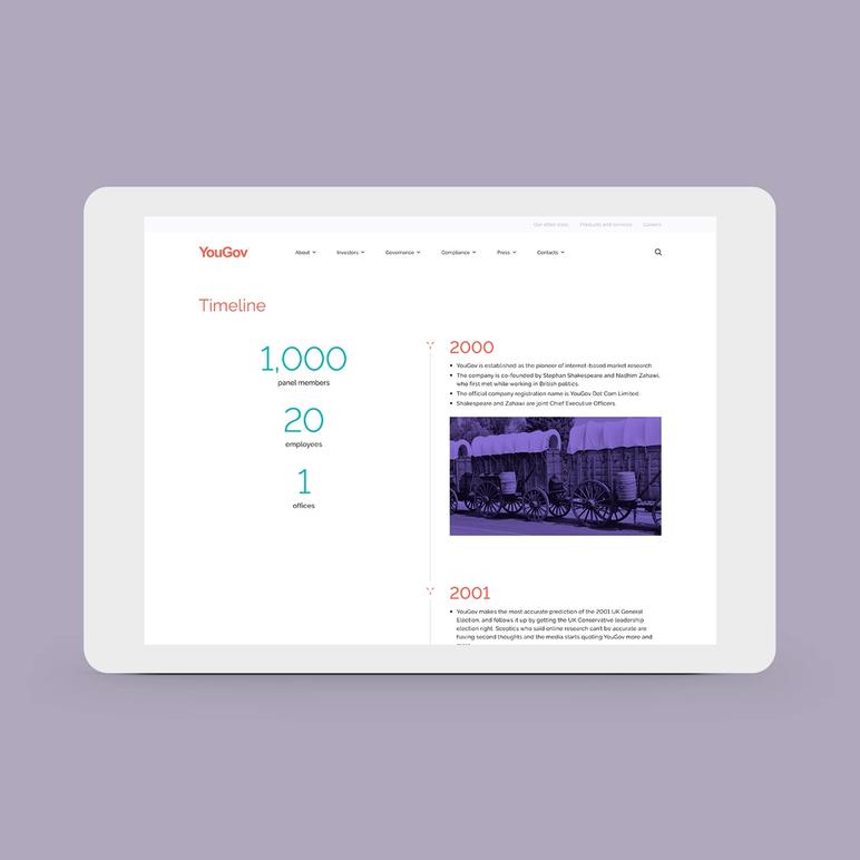 Seamlessly linking to the YouGov brand and careers websites, the company website now delivers a modern digital experience that primarily caters to investors, brokers, analysts and a financial press audience. It is an exemplar of clarity of content and strong brand personality that gives YouGov a well-articulated online presence that fully celebrates its corporate story in the digital space.